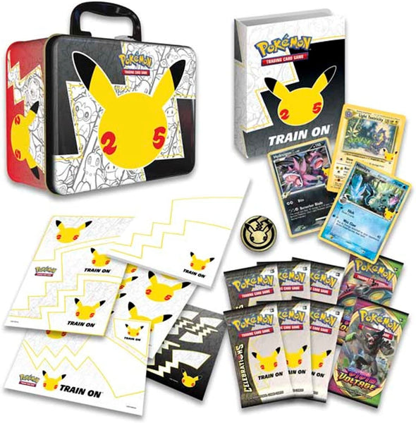 6 Pokémon TCG: Celebrations 4-card booster packs 2 additional Pokémon TCG booster packs 3 foil promo cards a Pokémon coin 4 colourful sticker sheets a mini portfolio a notepad an information sheet a code card for the Pokémon Trading Card Game Online
