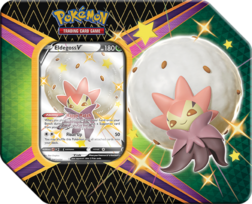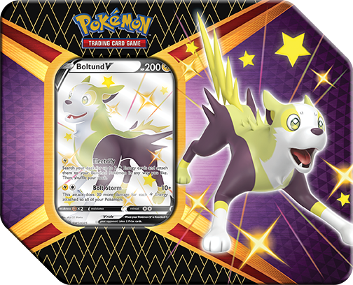 The shiny vault is full of distintively colored Pokemon, including three especially fine ones from the Galar region! Choose the fluffy power of Eldegoss V, the lightning strikes of Boltund V, or the watery missiles of Cramorant V in the Pokemon Trading Cards Game : Shining Fates Tin.