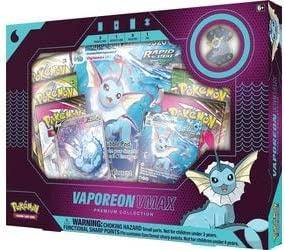 With three outstanding Evolutions to choose from, these Pokémon VMAX Premium Collections let you show off your elemental mastery! Vaporeon VMAX offers the relentless force of the sea, Jolteon VMAX brings maximum voltage, and Flareon VMAX has power to burn! Each collection includes three gorgeous full-art cards, including an oversize card of the star Pokémon VMAX for display, plus a pin and 5 booster packs.